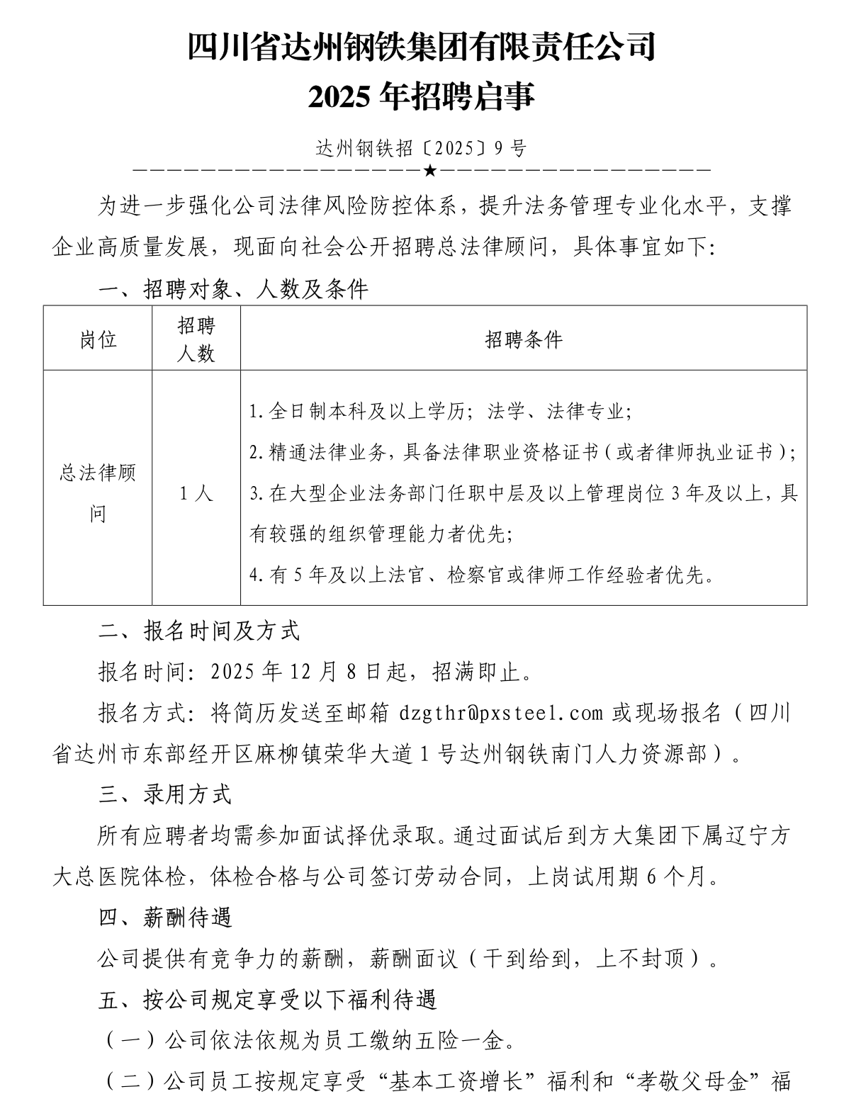 四川省达州钢铁集团有限责任公司2025年招聘启事