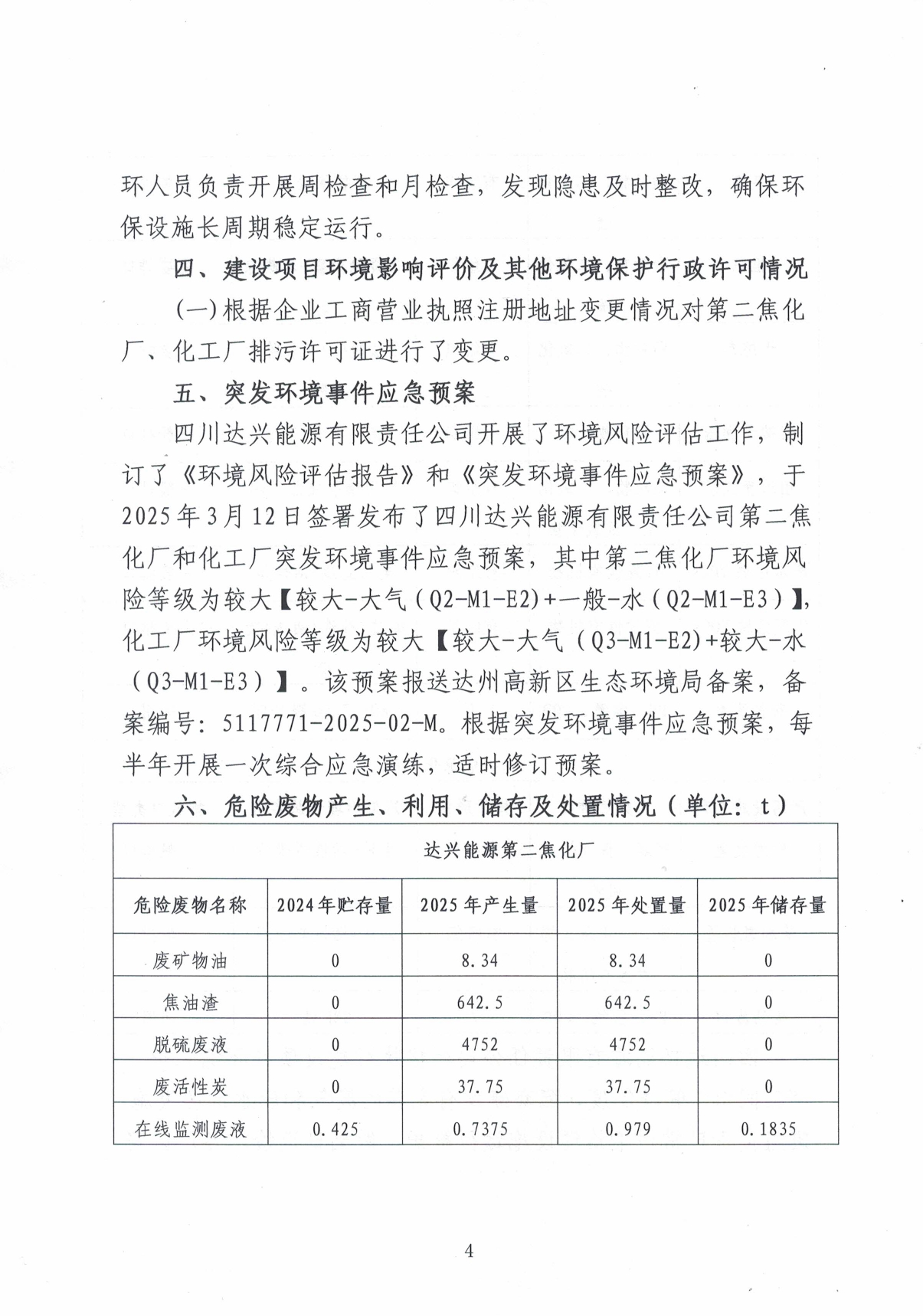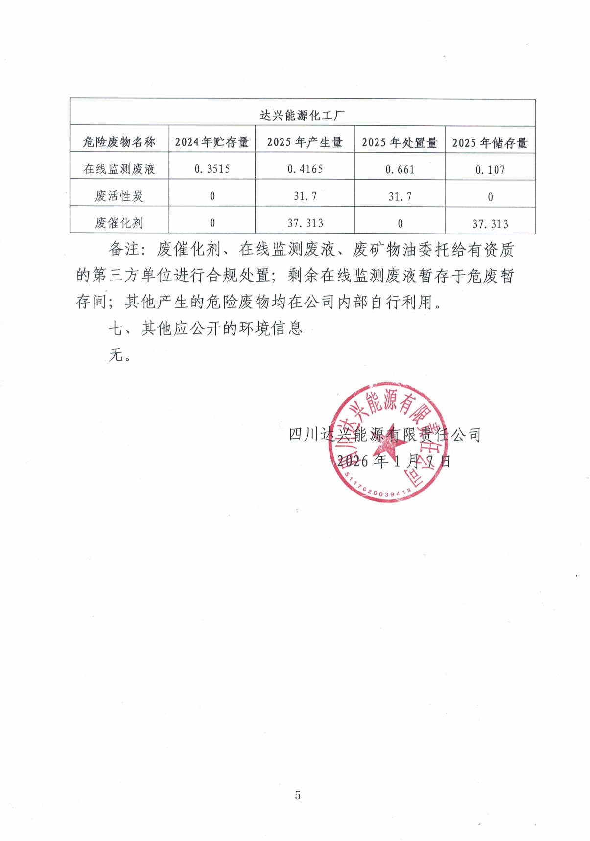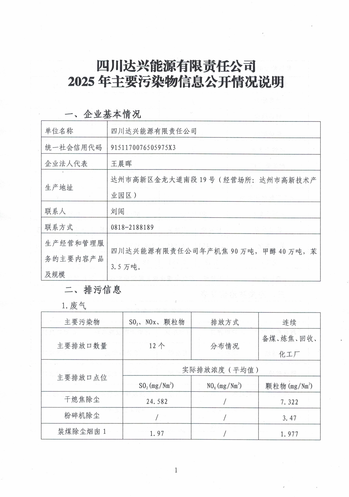 四川达兴能源有限责任公司2025年主要污染物信息公开情况说明